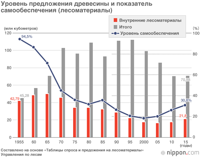 После выхода на пиковый показатель (1 158 200 000 000 йен) в 1980 году объёмы продукции японской лесной промышленности стали неуклонно сокращаться, и в 2014 году составили меньше 450 миллиардов йен. За тот же период численность работников этой промышленности, составлявшая некогда 146 000 человек, сократилась до одной трети, и по всей стране стали появляться заброшенные леса. Огромный ущерб, наносимый наводнениями и оползнями во время тайфунов и сильных ливней, обусловлен именно нарушением лесного баланса.